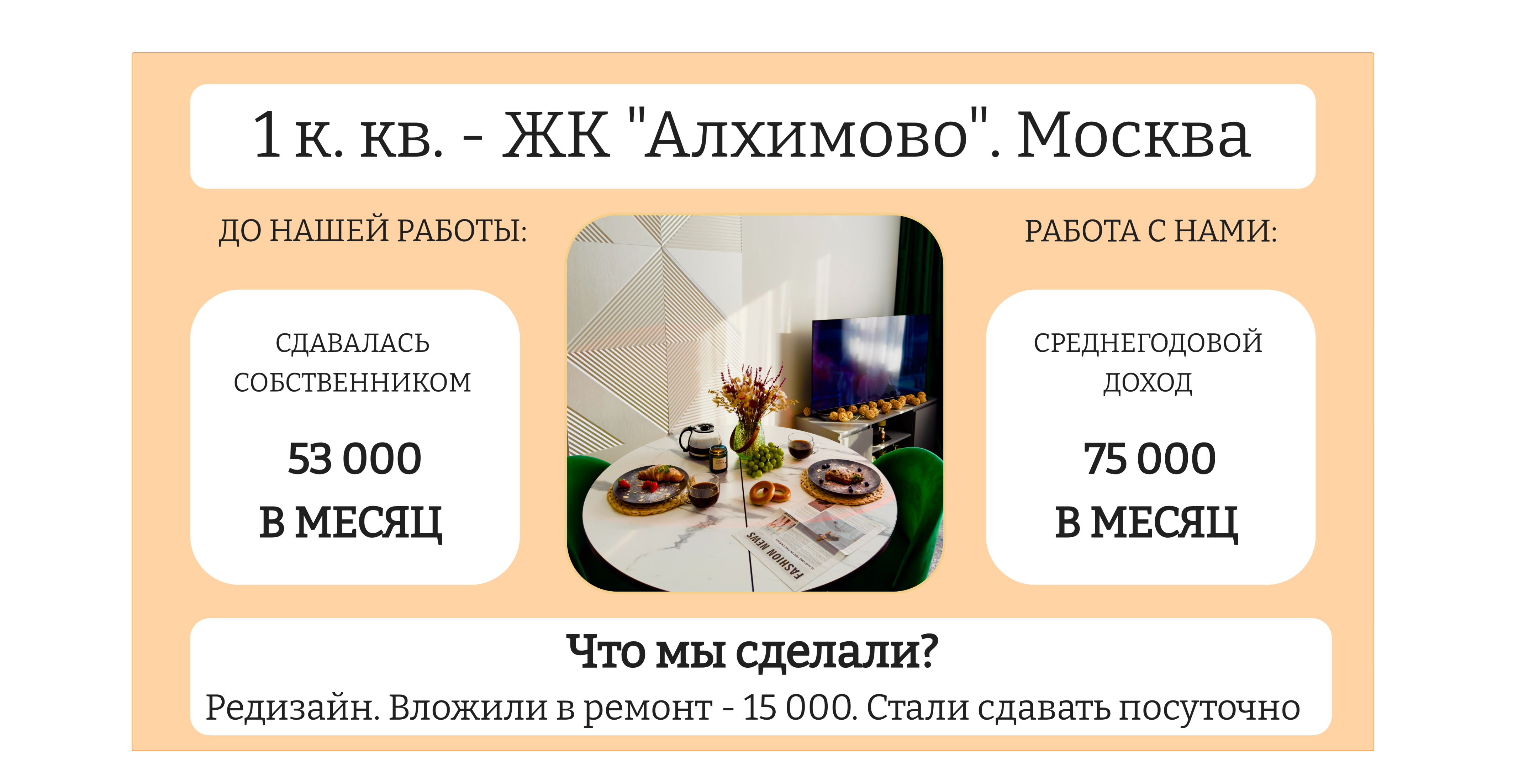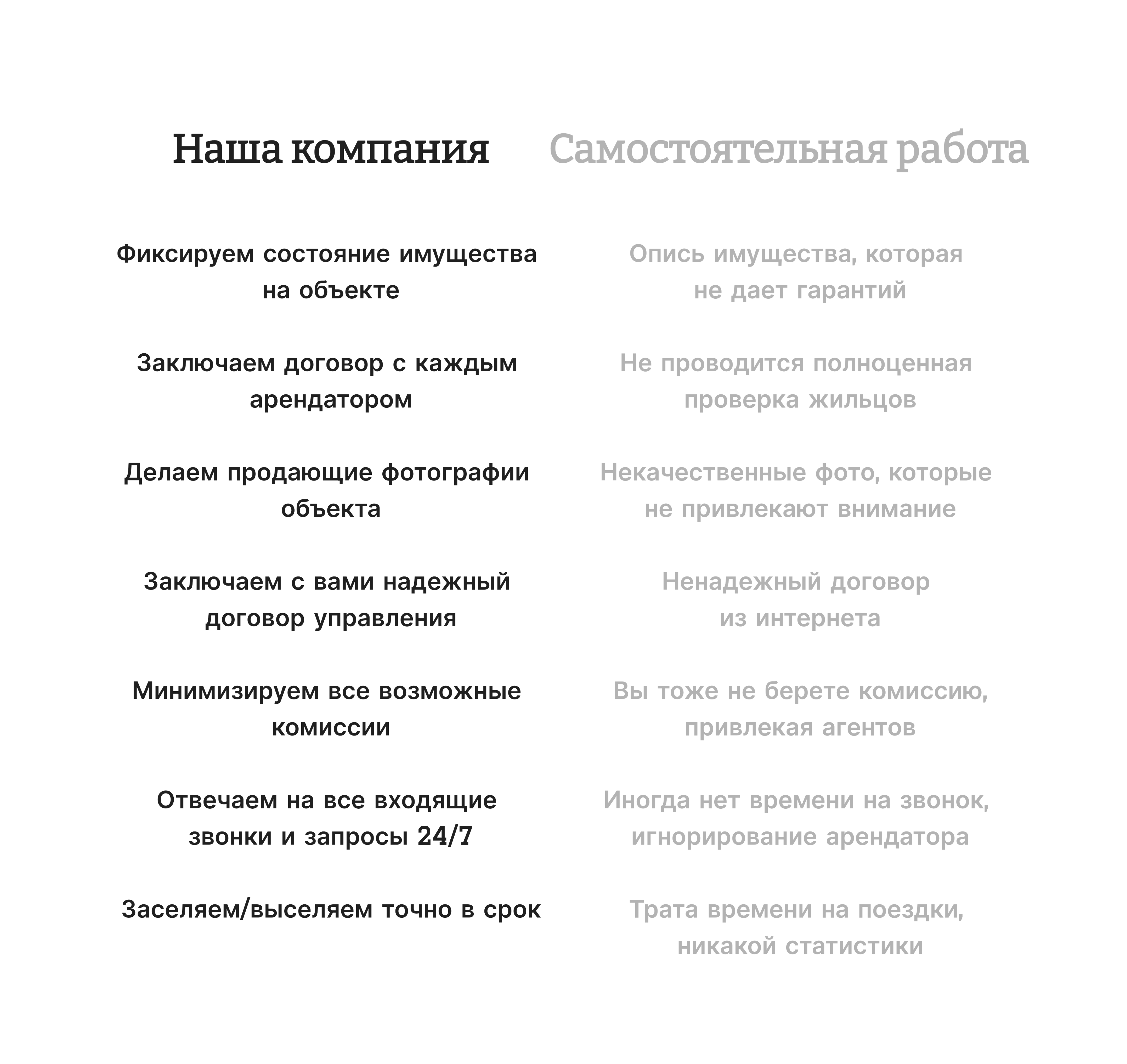 Вы передаете объект в посуточное управление и полностью забываете о нем. Получаете чистую прибыль в среднем больше на 20-80%, чем получали раньше.